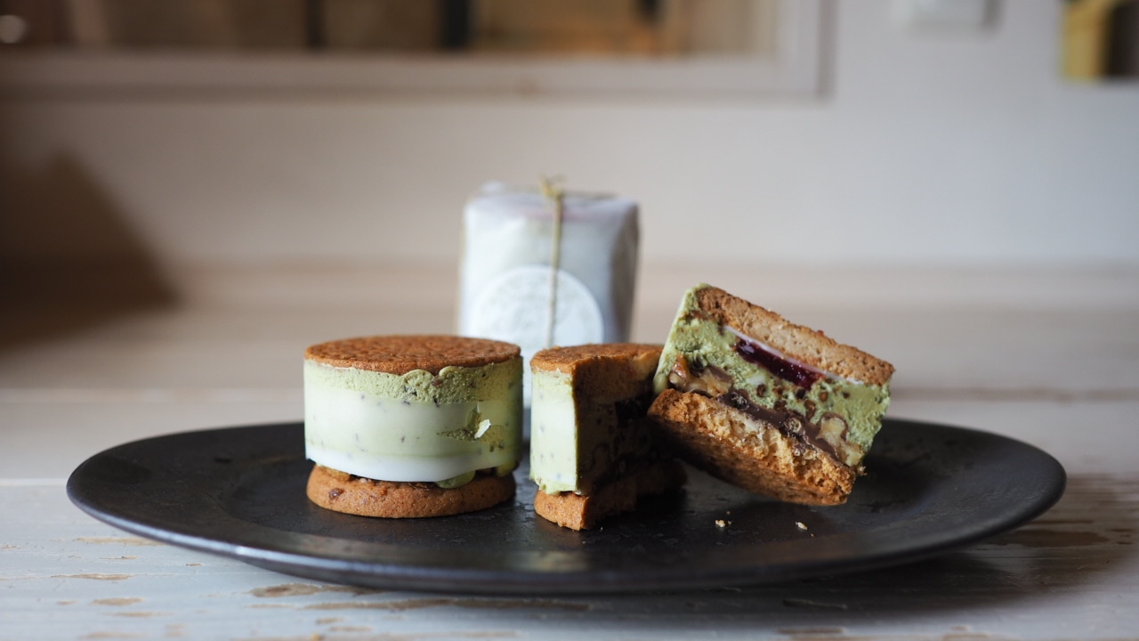イタリアシチリア島のエトナ山麓のブロンテ村で生産される濃厚なピスタチオを使用したピスタチオのレアチーズ、フランス産木苺を使用した木苺のコンフィチュール、キャラメリゼした胡桃を静岡県沼津産戸田塩を使用したこだわりの塩バターサブレでサンドしました。ピスタチオは無着色のピュアタイプを使用しています。