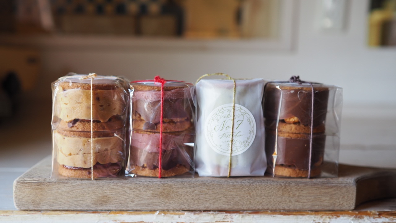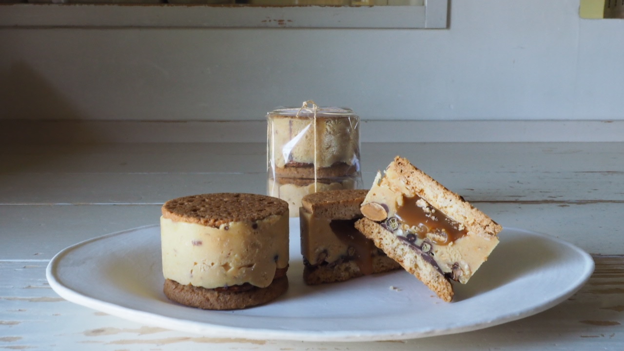 ローストしたクラッシュアーモンド入りキャラメルの生チョコレート、キャラメルがけした胡桃、じっくりと炊き上げた濃厚でほろ苦いキャラメルソースを北海道産小麦粉、北海道産バター、奄美大島産素焚糖、沼津戸田塩を使用したこだわりの塩バターサブレでサンドした贅沢なクッキーサンドです。