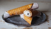 素材にこだわった自家製ワッフル生地を手焼きし、くるりと巻いた中にラムレーズン入りレアチーズを絞りました。