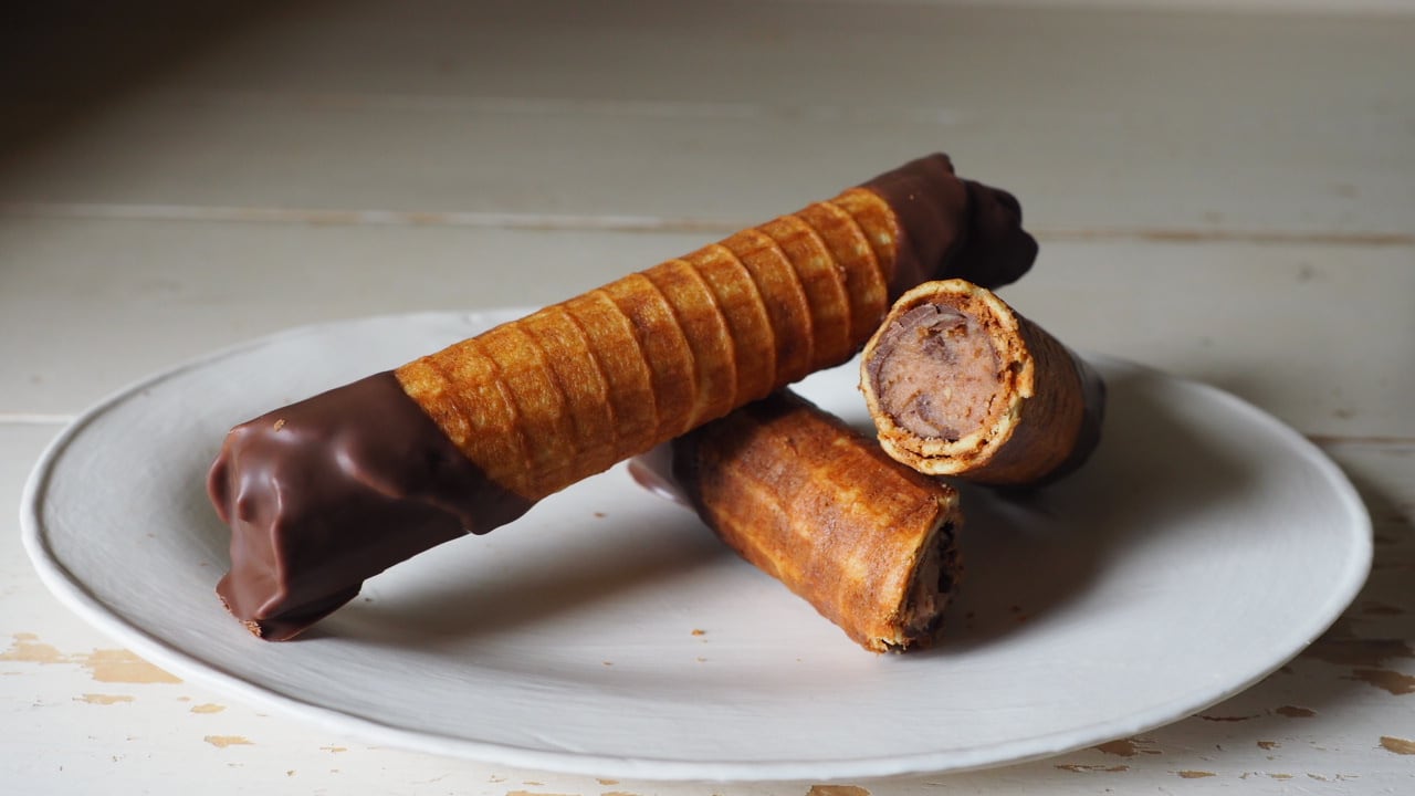 素材にこだわった自家製ワッフル生地を手焼きし、くるりと巻いた中にスペイン産栗を使用したマロンクリームを絞りました。