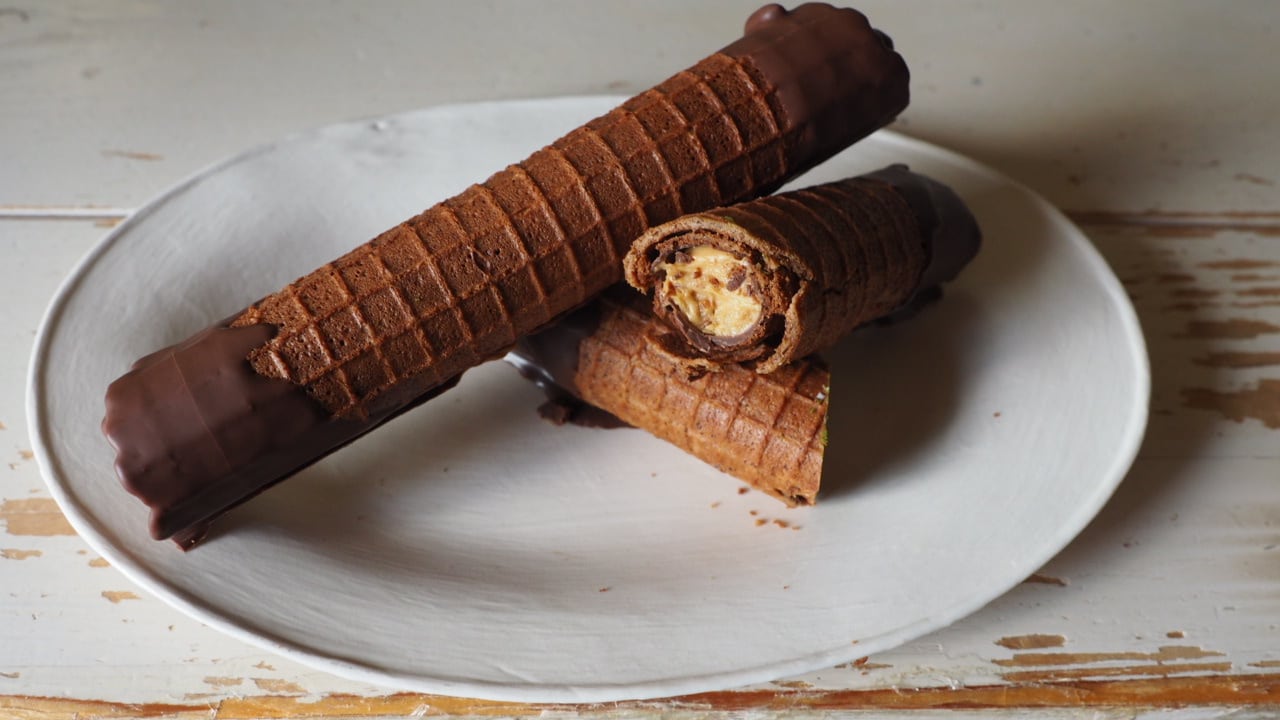 素材にこだわった自家製ワッフル生地をくるりと巻き、中にじっくりと炊き上げた濃厚でほろ苦いキャラメルの生チョコレート、クラッシュしたアーモンド、シリアル入りチョコレートを絞りました。