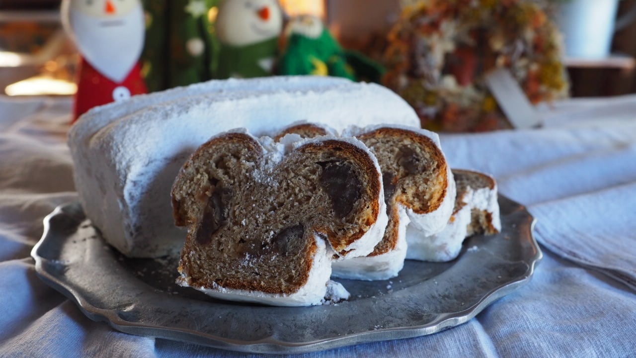 シュトレンはクリスマスを待ちながら少しずつ食べる醗酵菓子です。上質なイタリア産栗、胡桃、マジパンローマッセを練り込んだ生地にクローブ、シナモン、カルダモン、ナツメグの4種類のスパイスと芳醇なバニラビーンズを合わせ、丁寧に醗酵、焼成しました。仕上げにたっぷりの粉砂糖をまぶしてしっとりとした味わいを閉じ込めています。