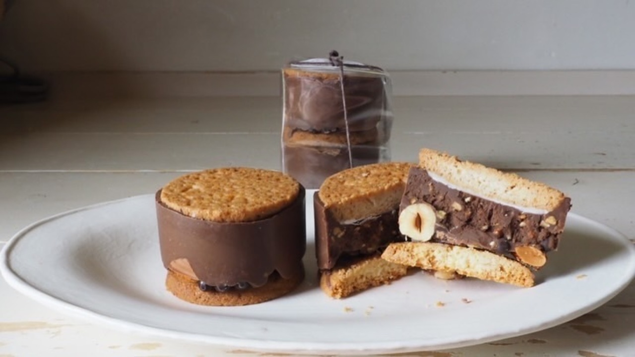 キャラメリゼしたアーモンド、胡桃、ヘーゼルナッツ入りミルクチョコの生チョコレートを北海道産小麦粉、北海道産バター、奄美大島産素焚糖、沼津戸田塩を使用したこだわりの塩バターサブレでサンドした贅沢なクッキーサンドです。