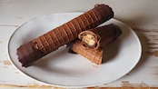 素材にこだわった自家製ワッフル生地を手焼きし、くるりと巻いた中にじっくりと炊き上げた濃厚でほろ苦いキャラメルの生チョコレート、クラッシュしたアーモンド、シリアル入りチョコレートを絞りました。