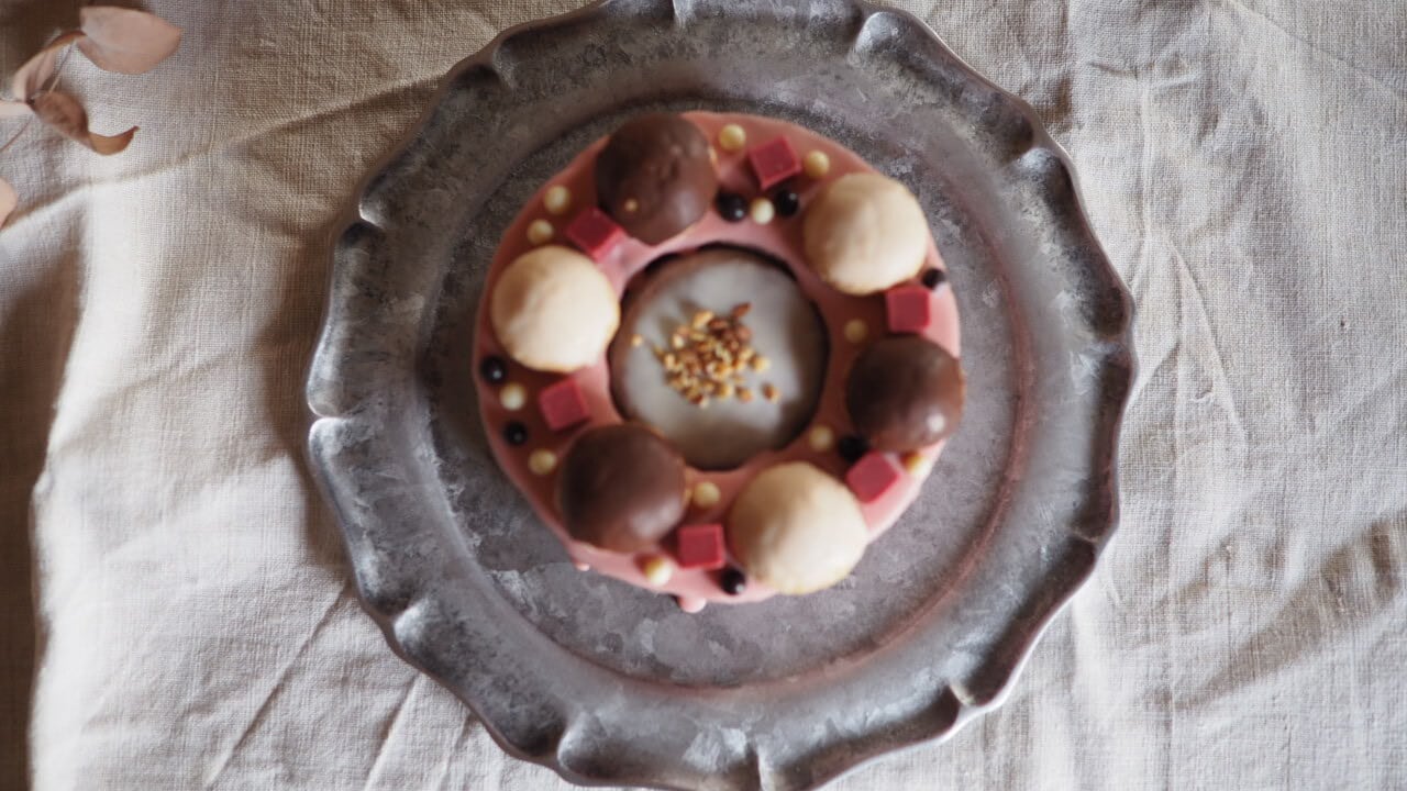 ミーネのバウムクーヘンはシェフがドイツで修行している時に習得した技術をもとに火加減や回転速度など微調整をしながら一層一層丁寧に焼き上げたこだわりの逸品です。素材にこだわり、乳化剤、添加物などは一切使用していないしっとり密な生地が特徴です。一口食べるとラム酒やスパイスの香りが口の中に広がります。このこだわりのバウムクーヘンの真ん中に苺のコンフィチュール入りのアーモンドバターケーキを入れ、苺のチョコレートをかけて春らしい仕上がりにいたしました。