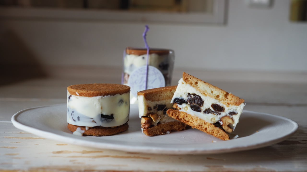 ラム酒につけた上質なオーガニックレーズン入りレアチーズ、キャラメリゼした胡桃の香ばしさを重ね、静岡・戸田産の塩をきかせた塩バターサブレでサンド。